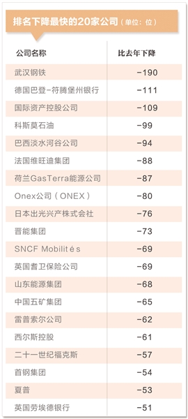 榜上排名上升最快的中国公司是中粮集团有限公司,排名从去年的第401位上升至今年的272位。其次是招商银行,排名由第350位上升至235位。在新上榜与重新上榜的23家公司中,中国公司独占10家,分别是中国铁路工程总公司、陕西煤业化工集团、中国光大集团、仁宝电脑、中国航天科技集团公司、中国保利集团、海航集团、友邦保险、国泰人寿保险股份有限公司、台积电。陕西煤业化工集团、中国光大集团、中国航天科技集团公司、中国保利集团、海航集团等5家中国内地公司首次上榜。从排名上升与新入围名单看,再次印证中国金融企业的整体实力上升。