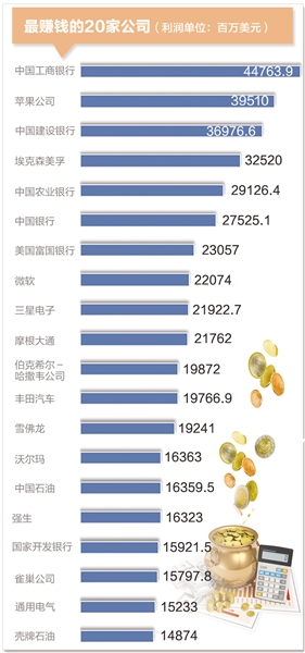 如果按利润将所有上榜公司从高到低排列,中国工商银行以447.6亿美元的利润成为今年世界500强利润最高的公司。其他进入盈利前50名的中国公司还有中国建设银行、中国农业银行、中国银行、中国石油天然气集团公司、国家开发银行、交通银行、中国移动通信集团公司、国家电网公司、招商银行、和记黄埔有限公司、中国海洋石油总公司、台积电,总共12家,占比24%。其中银行与能源企业占绝对多数,主力军多为国有企业。