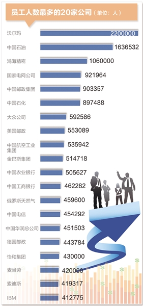中国内地上榜的民营企业中,华为投资控股有限公司排名由去年的第285位上升至第228位、中国民生银行排名上升至第281位、浙江吉利控股集团排名下降至第477位。民营企业虽然入围的数量有限,但从排名总体上升看其竞争力继续呈现稳步增强趋势。解决就业能力是体现企业对经济社会发展整体贡献的重要指标。在前50家员工人数最多的企业中,中国企业独占17家,其中中国石油天然气集团公司拥有员工163万多名,仅次于沃尔玛的220万人,位居全球第二。